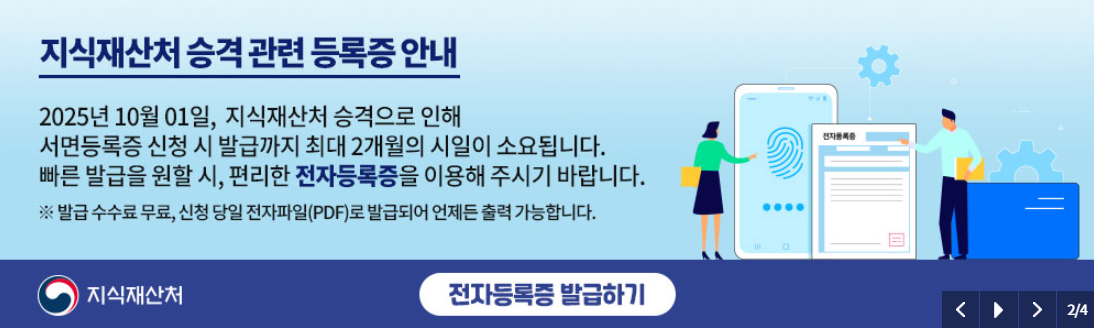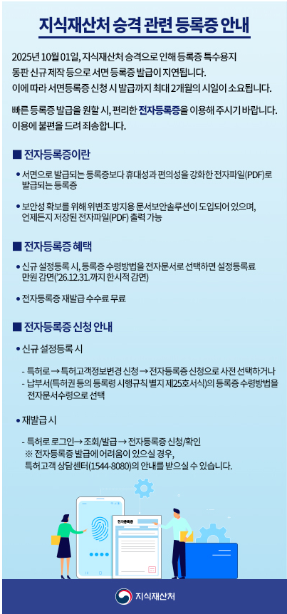 2025년 10월 1일부터 특허청이 '지식재산처'로 승격됨에 따라 등록증 발급 정책이 변경되어 안내드립니다.