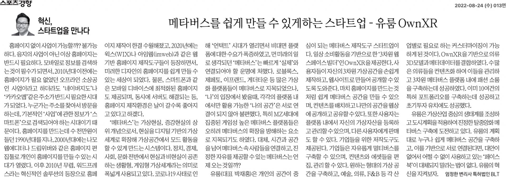 유룸(대표 박재홍)은 개인의 공간이 중심이 되는 메타버스 제작도구 스타트업이다. 일상 소비활동을 기반으로 한 ‘3차원 웹스페이스 빌더’인 OwnXR을 제공한다. 사용자들이 자신의 3차원 가상공간을 손쉽게 제작하고, 웹사이트로 만들어 공개할 수 있도록 도와준다. 마치 홈페이지를 만드는 것 처럼 쉽게 메타버스 공간을 만들 수 있으며, 컨텐츠를 배치하고 나만의 공간을 웹상에 공개하고 공유할 수 있다. 또한 사용자는 플랫폼 내에서 자신의 가상자산을 등록하고 관리할 수 있으며, 다른 사용자에게 판매도 할 수 있다. 기업들을 위한 저작도구도 제공된다. 기업들은 자유롭게 멀티버스를 구축할 수 있으며, 컨텐츠와 에셋들을 편집, 관리 할 수 있다. 원하는 형태의 가상 공간을 구축하고, 예술, 의류, F&B 등 각 산업별로 필요로 하는 커스터마이징이 가능하게 된 것이다. OwnXR을 기반으로 의류 3D모델과 메타데이터를 결합하였다. 수 많은 의류들을 컨텐츠화 하여 이들을 관리하고 3차원 메타버스 플랫폼 내에 패션 쇼룸을 구축하는데 성공하였다. 이미 10여건의 특허 포트폴리오를 구축하는데 성공하고 초기투자 유치에도 성공했다.