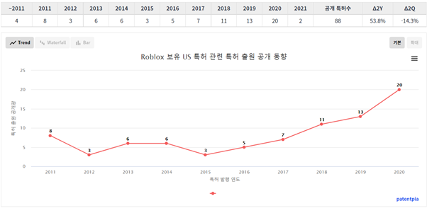 메타버스 분야의 특허는 상황이 어떨까? 메타버스의 선두업체라고 할 수 있는 로블록스(ROBLOX)의 특허를 살펴보았다. 로블록스는 미국 특허청에 88개의 특허를 출원한 것으로 집계되었다. 매년 특허출원의 숫자가 늘어나고 있는데다, 출원 후 18개월이 지나야 출원 여부에 대한 정보가 공개된다는 점을 고려할 때, 2021년에는 20건 이상의 특허출원이 진행된 것으로 예상된다.