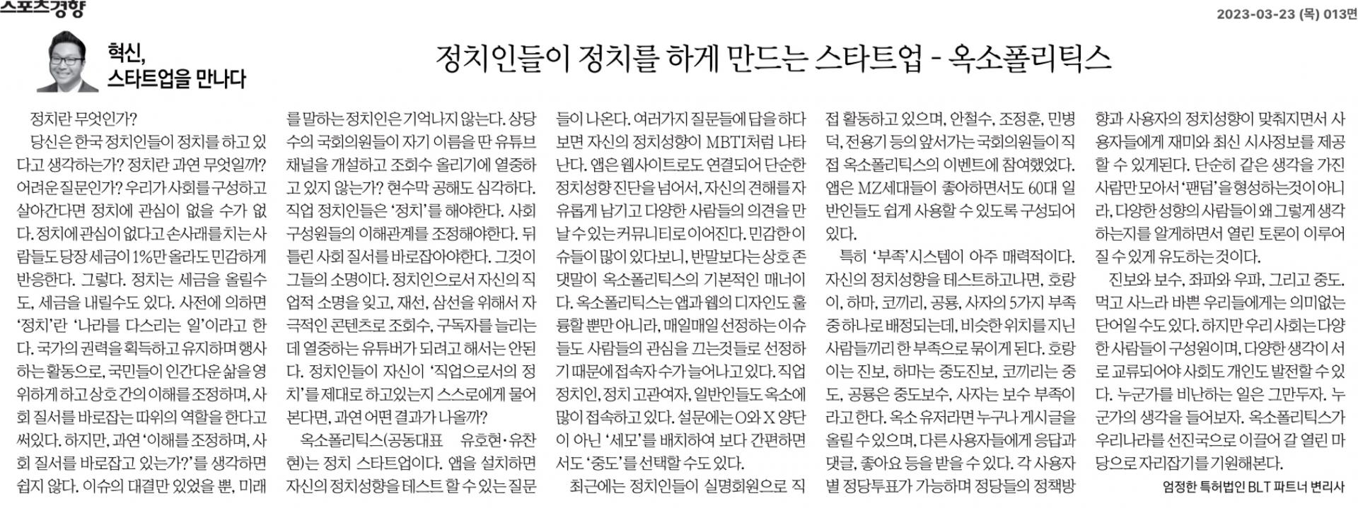 옥소폴리틱스(공동대표 유호현·유찬현)는 정치 스타트업이다. 앱을 설치하면 자신의 정치성향을 테스트 할 수 있는 질문들이 나온다. 여러가지 질문들에 답을 하다보면 자신의 정치성향이 MBTI처럼 나타난다. 앱은 웹사이트로도 연결되어 단순한 정치성향 진단을 넘어서, 자신의 견해를 자유롭게 남기고 다양한 사람들의 의견을 만날 수 있는 커뮤니티로 이어진다. 민감한 이슈들이 많이 있다보니, 반말보다는 상호 존댓말이 옥소폴리틱스의 기본적인 매너이다. 옥소폴리틱스는 앱과 웹의 디자인도 훌륭할 뿐만 아니라, 매일매일 선정하는 이슈들도 사람들의 관심을 끄는것들로 선정하기 때문에 접속자 수가 늘어나고 있다. 직업 정치인, 정치 고관여자, 일반인들도 옥소에 많이 접속하고 있다. 설문에는 O와 X 양단이 아닌 ‘세모’를 배치하여 보다 간편하면서도 ‘중도’를 선택할 수도 있다.