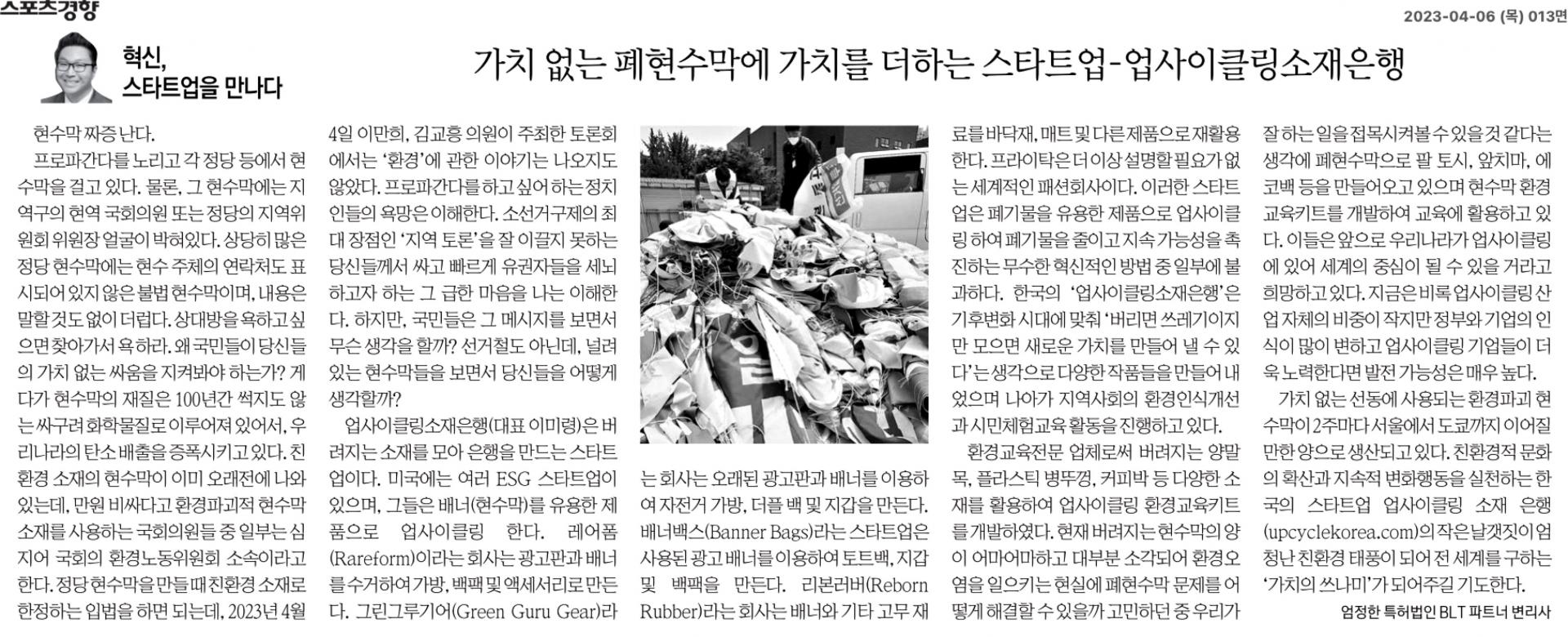 가치 없는 선동에 사용되는 환경파괴 현수막이 2주마다 서울에서 도쿄까지 이어질 만한 양으로 생산되고 있다. 친환경적 문화의 확산과 지속적 변화행동을 실천하는 한국의 스타트업 업사이클링 소재 은행(upcyclekorea.com)의 작은 날갯짓이 엄청난 친환경 태풍이 되어 전 세계를 구하는 ‘가치의 쓰나미’가 되어주길 기도한다.