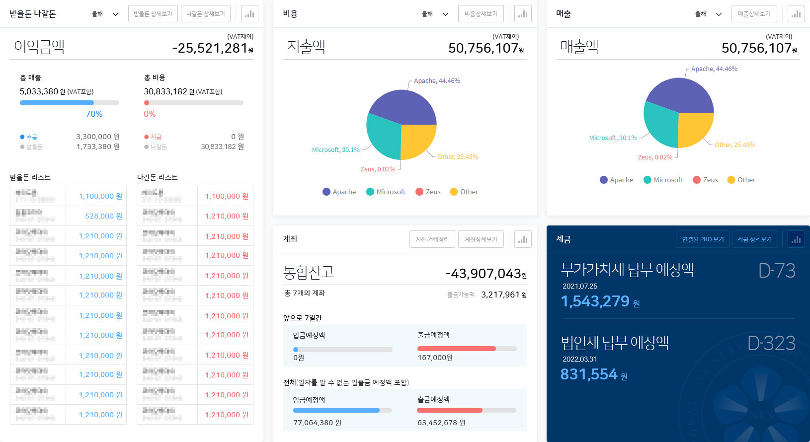 12년 경력의 세무사가 중심이 되어 만든 솔루션은 매우 현실적이다. 다수의 계좌정보가 하나로 통합되며 카드, 세금계산서, 현금영수증 등의 비용관리사 한 화면에서 이루어진다. 은행, 홈텍스, 카드사, 카드매출 등도 1번만 연동하면 재무데이터가 매일 업데이트 되므로 사용자 편의성이 매우 높다. 아침마다 카카오톡으로 보내주는 자금리포트도 사용자 친화적이다. 세부 업종별로 빅데이터 학습을 통해 통장을 분석하므로, 거래내역이 자동으로 정리되며 여러개의 회사를 관리해야하는 CEO들도 한 화면에서 그 회사들을 관리할 수 있다. 나갈 돈, 받아야 할 돈을 한 눈에 살피면서 세금관리까지 편리하게 할 수 있어서, 사용자들의 호평이 이어지고 있다. 다수의 특허를 확보하였으며, 이를 기반으로 그라운드업벤처스, 더인벤션랩 등으로부터 투자유치에 성공했다.